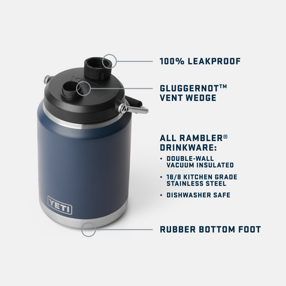 The human fuel tank that keeps your thirst quenched from dusk 'til dawn. Built with double-wall vacuum insulation, the Rambler® Half Gallon Jug keeps the sips ice-cold (or piping hot) to the very last drop.The leakproof MagDock™ Chug Cap locks in liquid and every pour is smooth with the removable Glugger-Not™ Vent.