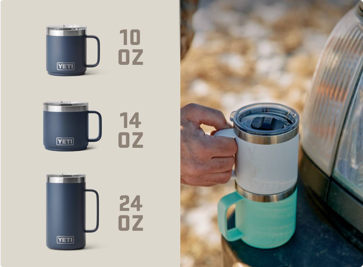 • Woman holding a YETI mug outdoors with YETI mug sizes displayed on a white background.