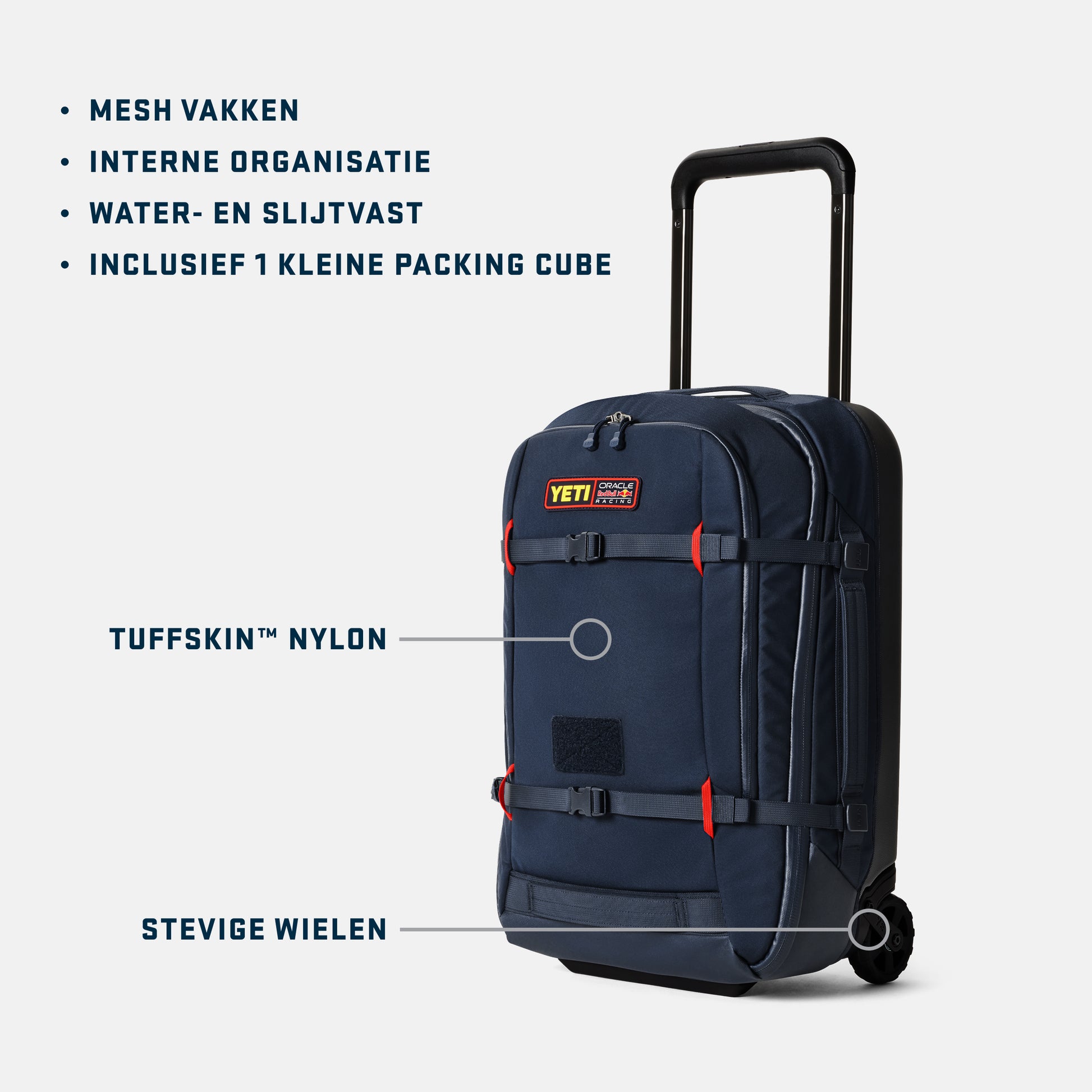 Met 24 races verspreid over de hele wereld heeft het Oracle Red Bull Racing-team ultraduurzame en draagbare bagage nodig die hen niet afremt. Deze tas, gemaakt van TuffSkin™ nylon en met robuuste wielen, is ontworpen om mee te nemen in de bagagevakken en op reizen met overnachting. Meerdere handgrepen aan de buitenkant maken het gemakkelijk om hem om te dragen, te tillen en te laden, en een brede opening geeft je volledig zicht op je spullen. Het verdeelschot is ontworpen voor optimale organisatie en heeft twee meshvakken om duidelijk te zien waar je benodigdheden hebt opgeborgen en een speciale sleeve in het voorpaneel om je laptop veilig op te bergen. De verwijderbare modulaire compressiebanden voor intern of extern gebruik zijn ideaal om extra uitrusting op te bergen. Om onze gezamenlijke inzet voor buitengewone prestaties te vieren, brengen we de officiële teamversie van de als hand- en ruimbagage geschikte Crossroads® bagage uit. Red Bull® markeringen en de Red Bull Racing-logo's zijn in licentie gegeven door Red Bull GmbH/Oostenrijk.